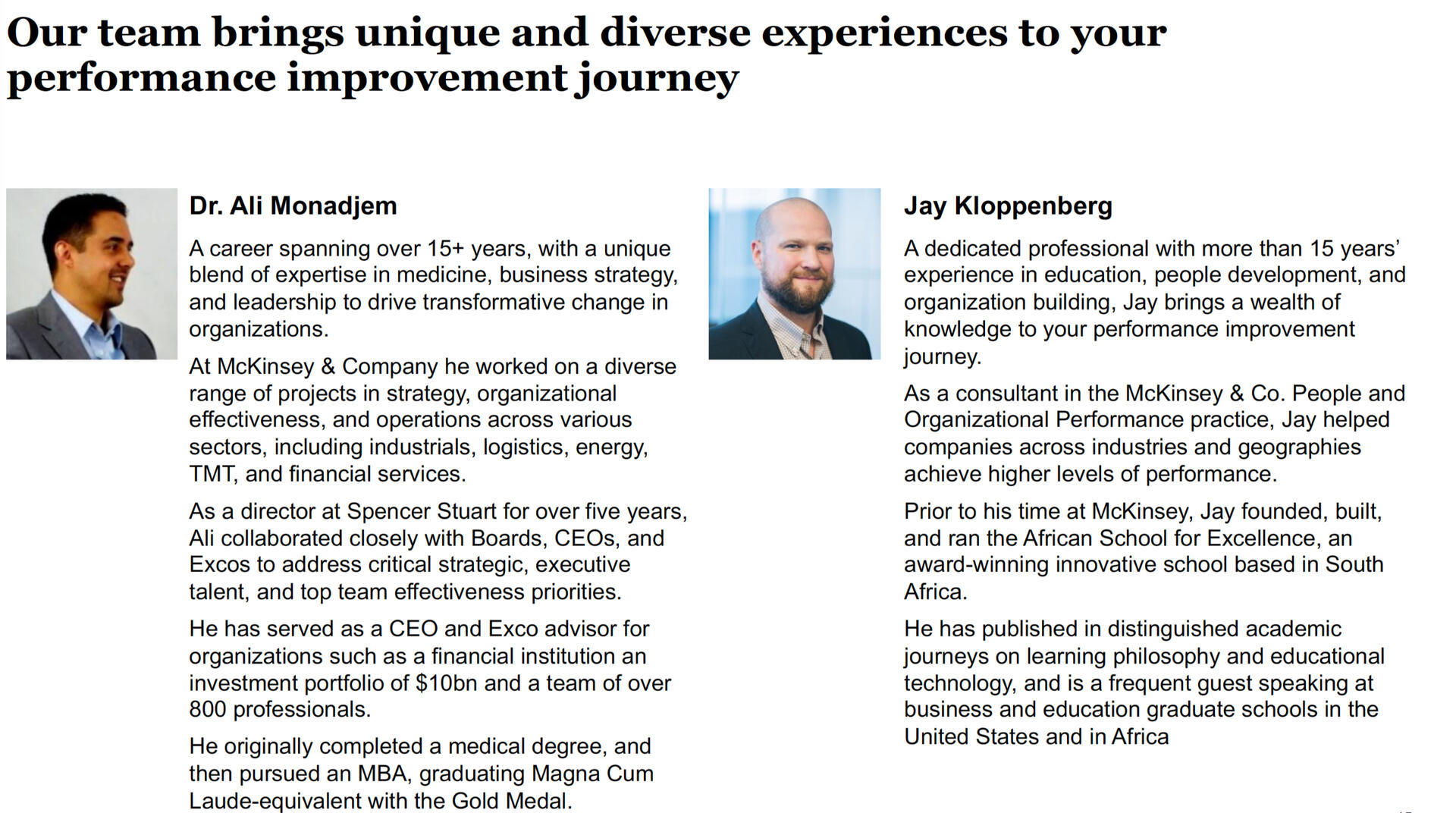 The Impactful Executive is led by McKinsey alumni Dr Ali Monadjem and Jay Kloppenberg, and is a division of Accompany Advisory Ltd.The Impactful Executive team leverages the IMPACTFUL ©️ model to drive a simple, stepwise approach for top team performance improvement. Further details below.